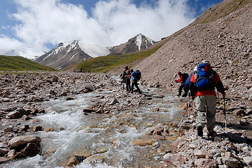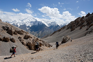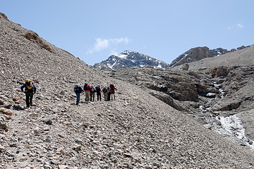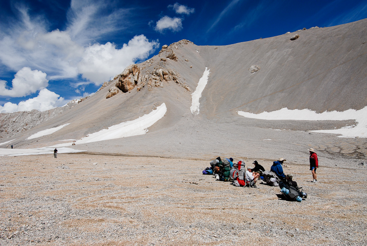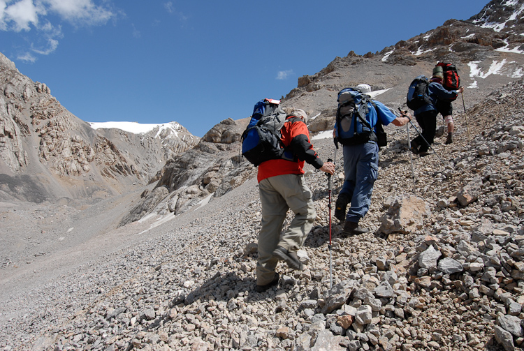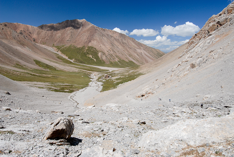Über Hochalmen und Geröllfelder führt der Pfad hinauf auf den 4001 m hohen Tjuz Pass, den Übergang in das Tal des Südlichen Inylchek Gletschers.