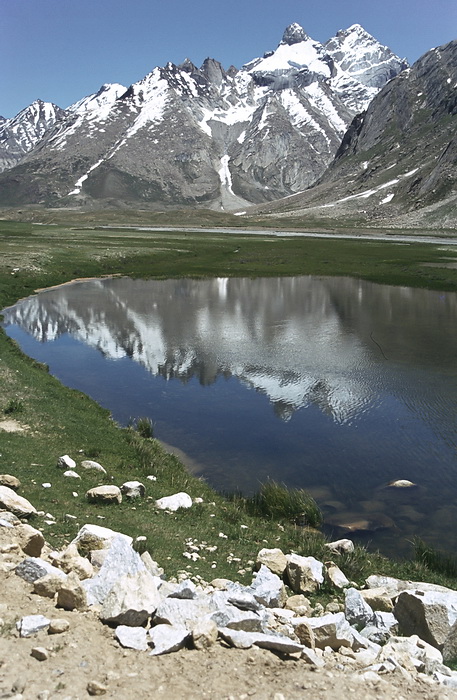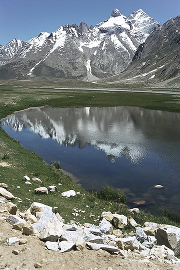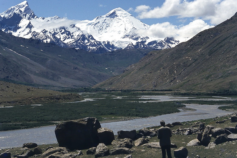 Auf einem LKW fuhren wir von Kargil den Suru Fluss hinauf bis im Süden die Gipfel des Nun (7133 m Bildmitte) und des Kun (7085 m rechts) auftauchten.