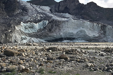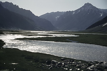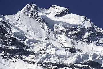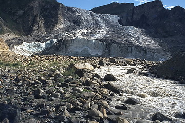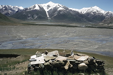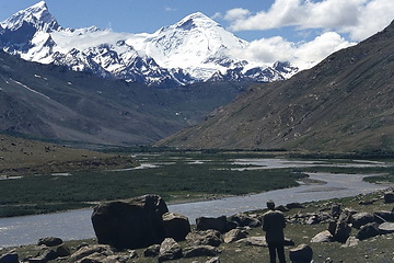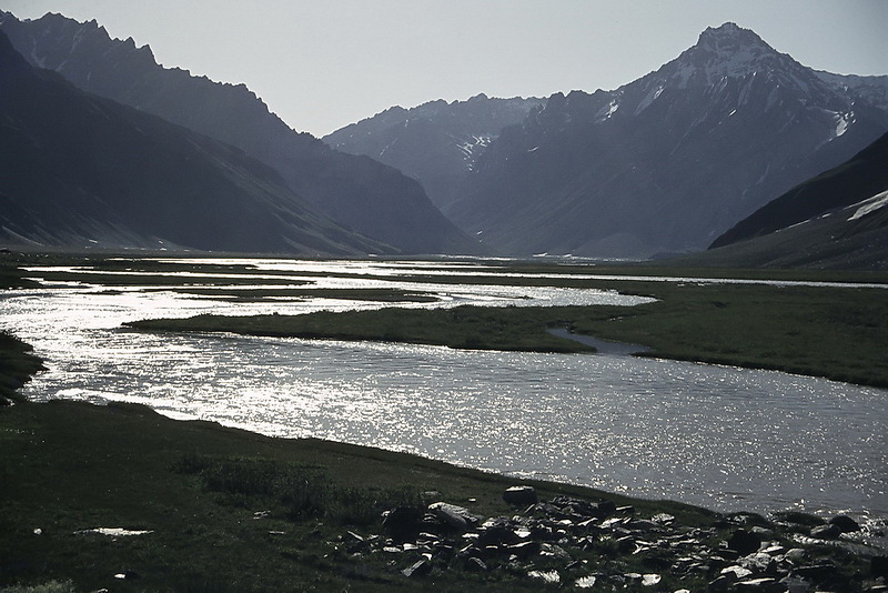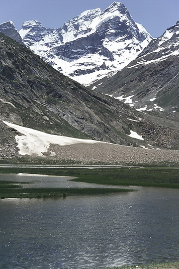 We started our trekking at Parkachik (3.700 m). The road through the gorge of the Suru river was still closed due to avalanche snow. The satellite photo shows the Parkachik glacier flowing down from Kun into the Suru river.