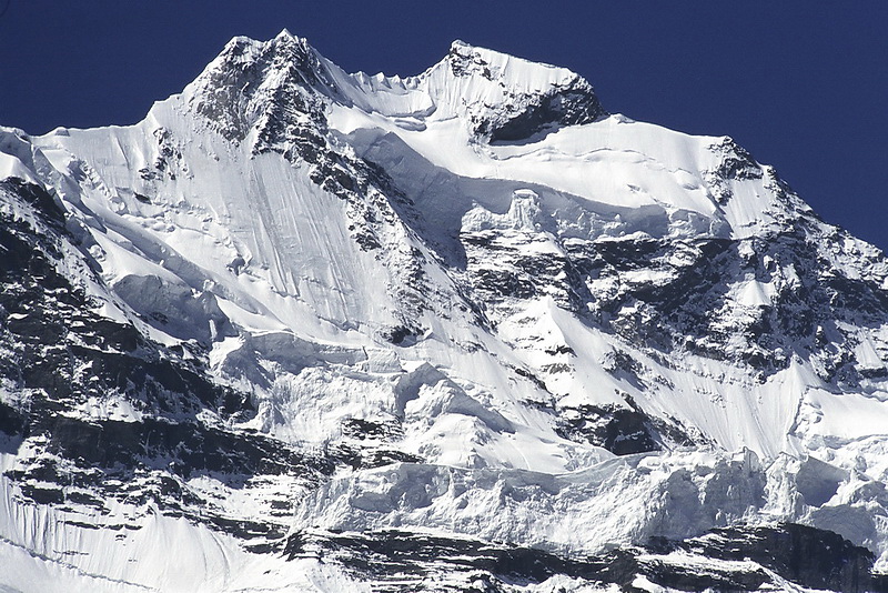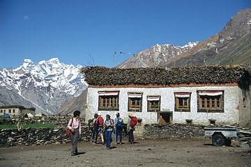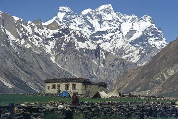 The houses of Yuldo are built in Tibetan Style. The mountains in the background are Kun (7.085 m - center) and Pinnacle Peak (6.930 m) to the right.