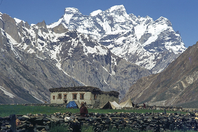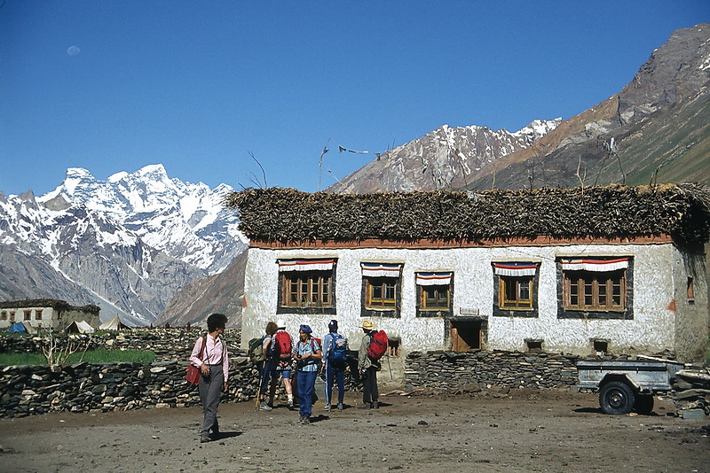 Yuldo besteht aus einigen im tibetischen Stil erbauten Häusern. In der Mitte etwas verdeckt der Gipfel des Kun (7085 m), rechts der Pinnacle Peak (6930 m).