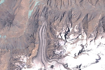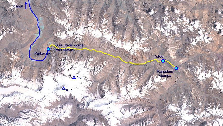 In Parkachik (3700 m) begann das Trekking entlang der wegen Lawinenschnees noch nicht befahrbaren Piste durch die Suru Schlucht nach Padam. Die Satellitenaufnahme zeigt den vom Kun herunter fliessenden Parkachik Gletscher, der in den Suru Fluss kalbt.
