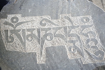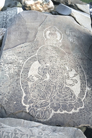 Bild 3/4: Das Mantra OM MANI PEME HUNG, welches die Lebewesen von der Illusion der Geistesgifte Stolz, Neid, Anhaftung an das Ego, Unwissenheit , Gier und Hass befreit.