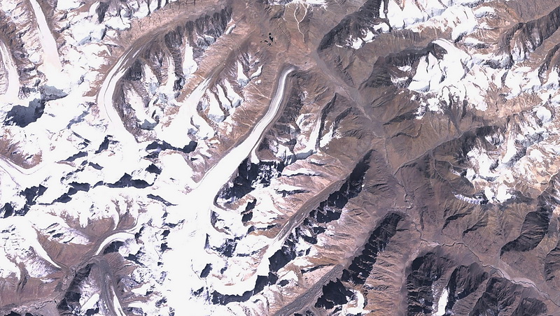 Numerous peaks of about 6.000 m are visible in the side valleys.