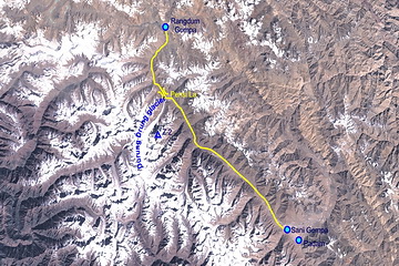 Der Durung Drung Gletscher auf der Südostseite des Pensi La gehört mit etwa 25 km Länge zu den längsten Himalaya Gletschern (s. Satellitenaufnahme). Er wird gesäumt von dem formschönen Doppelgipfel des Z2 (6270 m).