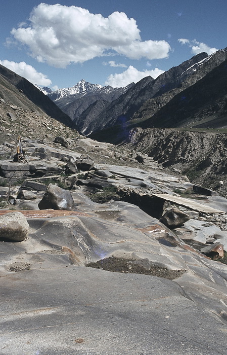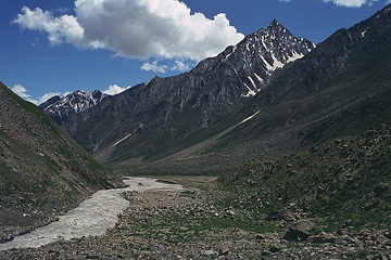 Kurz vor Darcha öffnet sich das Tal und man blickt südostwärts auf die Sechstausender von Lahoul.