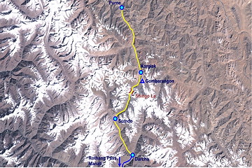 Noch einmal folgt eine fast 20 km lange Wanderung durch das Tal des Barai Kade Flusses hinaus nach Darcha. Darcha liegt an der Strasse zum Baralacha La, einem Pass der 1982 ausschliesslich dem Militär vorbehalten war und heute die direkteste Verbindung zwischen dem indischen Bundesstaat Himachal Pradesh und Leh darstellt.