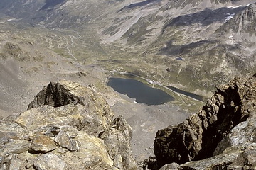 Tiefblick vom Flüela Schwarzhorn zum Flüela Pass.