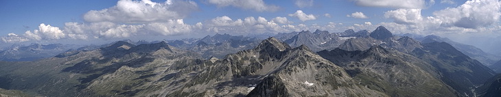 The north eastern part of the summit panorama shows Flüela Weisshorn with the summits of the Silvretta Range in the background.