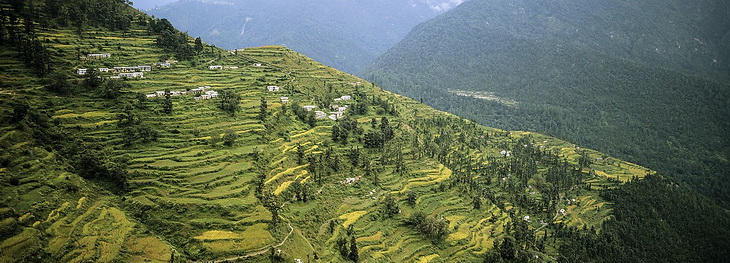 Am Anfang des Treks führt der Weg durch das Nandakini Tal vorbei an Ortschaften mit den für enge Bergtäler typischen Terassenfeldern.