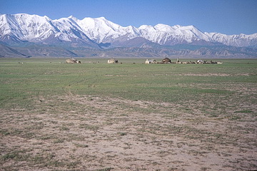 South of the Muksu River - which limits the western Transalai Range - Pik Communism (7495 m - now Pik Ismail Samani) and Pik Korshenewskaya (7105 m) are rising as the crossing points of two mountain ranges: Peter-1st - Range from west to east and Academy of Sciences Range from north to south. Another cumulation point 50 km south east of Communism Peak is Pik Revolution (6974 m) which forms the source of the Fedchenko Glacier, the longest ice stream in non-polar regions, about 77 km long. The Moskwin Camp at the foot of Pik Communism (Pik Ismail Samani) can only be reached by helicopter.