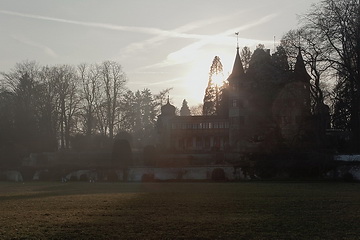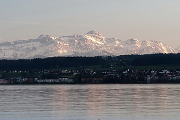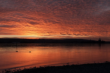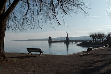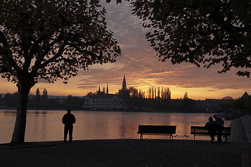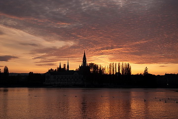 A late autumn view of Constance and the silhouette of the town seen from the park at Seeburg castle in Kreuzlingen, the neighbouring city in Switzerland.