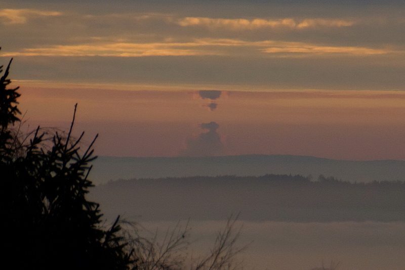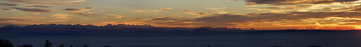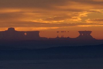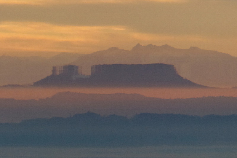 Mirages, a well-known phenomenon in the summer season, can also be observed in winter during a so-called inversion, special atmospheric conditions where the temperature increases with altitude. A change in temperature also implies a change in optical density and refraction index of the air layer and under special conditions the light is reflected back 'to earth' by the warmer layer (total reflection). Thus a second image - upside down in this case - is creating the table mountains in the picture below.