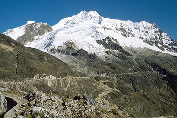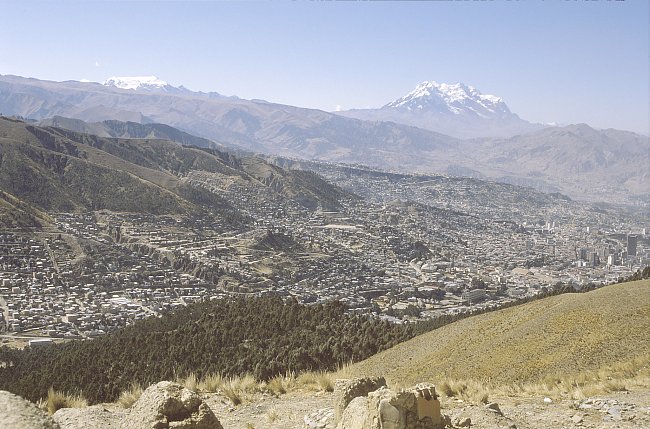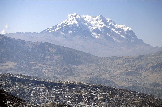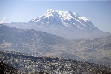 Driving from the worlds highest international airport - El Alto at 4100 m - to La Paz one gets a first view of Mururata (5775 m - flat summit) and Illimani (6462 m ) south east of La Paz. The starting point below the central summit is reached on an adventurous path (about 40 km).