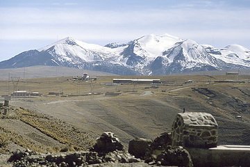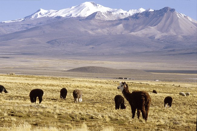 About 250 km south of Lake Titicaca - after crossing the 'Altiplano' - the mountains of the Cordillera Occidental are situated. These are - different to the Cordillera Real which are fold mountains - of volcanic origin. A weak zone in the earth's crust, caused by the fact that the oceanic 'Nazca' plate moves below the South American Plate is responsible for this. Here we also find the highest bolivian mountain - Nevado Sajama - surrounded by several other volcanoes higher than 6000 m.