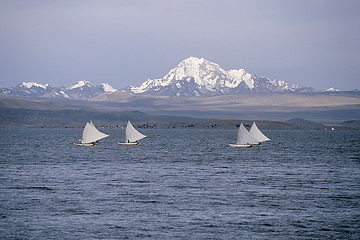 Segelregatta auf dem Titicacasee. Im Hintergrund die Nordwestseite des Huayna Potosi. Der intensive Sonnenuntergang dauert nur etwa 5 Minuten, weil sich die Sonne fast senkrecht auf den Horizont zu bewegt.