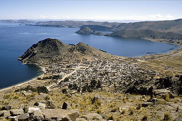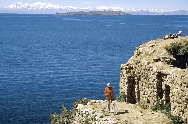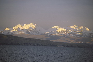 Copacabana at the Lake Titicaca with the Calvary below. From the sun-island we are looking across moon-island to the northern part of the Cordillera Real: Illampu (6362 m), Ancohuma (6427 m), Chearaco (6118 m), Chachacomani (6074 m), Condoriri (5656 m).