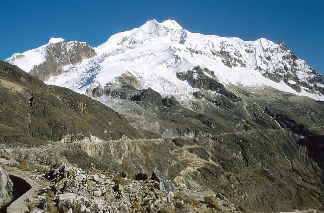Directly opposite - Huayna Potosi (6094 m). The standard ascent leads up the south face (picture right).