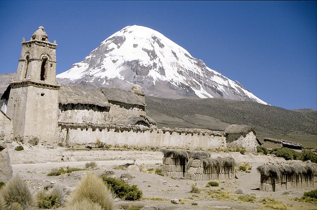 Der Nevado Sajama (6540 m) - der höchste Berg Boliviens - von der Strasse aus, welche Bolivien mit der chilenischen Hafenstadt Arica verbindet. Sie erreicht zwischen den Payachatas und dem Sajama die höchste Stelle des Altiplanos (ca. 4400 m). Der Gipfel ist über mässig steile Firnhänge ohne Schwierigkeiten (ausser der dünnen Luft) ersteigbar. Rechts daneben die Payachatas - Parinacota (6132 m - links) und Pomerape (6222 m).
