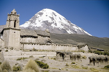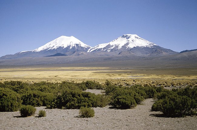Nevado Sajama (6540 m) - the highest mountain in Bolivia - taken from the road that connects Bolivia with the chilean seaport Arica. Between the Payachatas and the Sajama the road crosses the highest point of the Altiplano (4400 m). The summit can be reached across snow fields of moderate steepness without difficulties (except for the thin air). Right of it the Payachatas - Parinacota (6132 m - left) and Pomerape (6222 m).