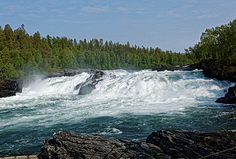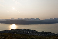 The next day starts in bright sunshine and so we don't mind driving back to Bardufoss on the same route as the day before. The Fjord scenery which is already fascinating on cloudy days is now showing itself in its best light. Shortly after Bardufoss we are paying a visit to Målselvfossen, a series of rapids of the Målselva river, 600 m long and 22 m high. After 150 miles of drivng we finally end the day enjoying the Midnight Sun on top of Fagernesfjellet 656 m high above the town of Narvik.