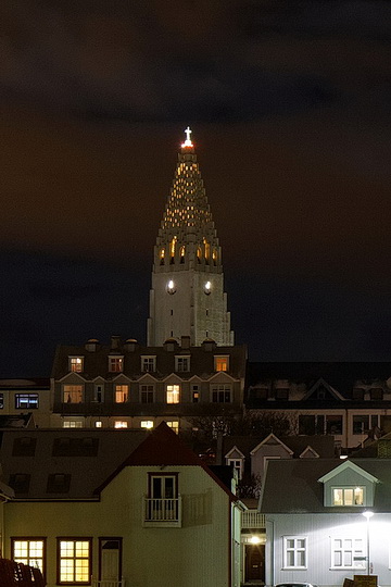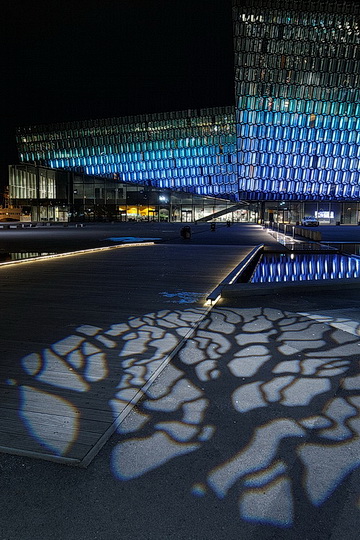 Auch vor der Harpa gibt es verschiedene Lichtinstallationen. Im Hintergrund die alles überragende Hallgrímskirkja, von der nur etwas mehr als das oberste Drittel zu sehen ist.