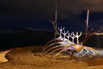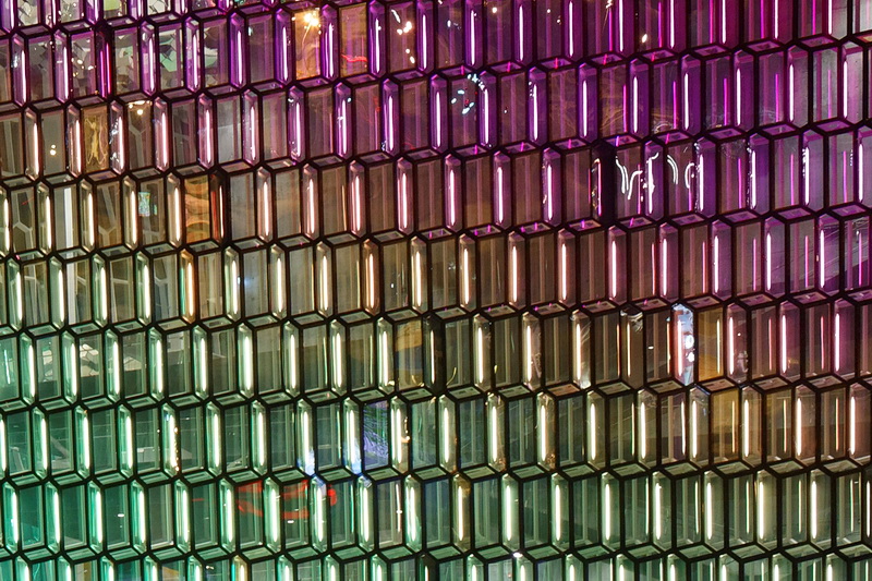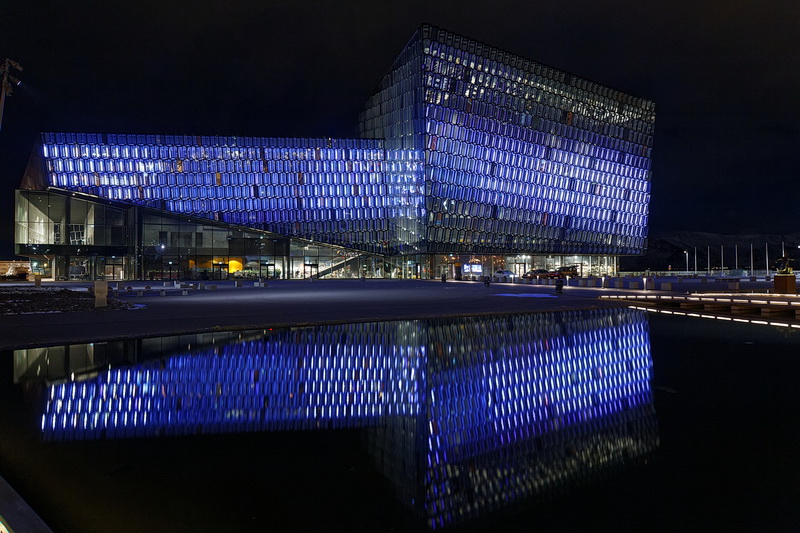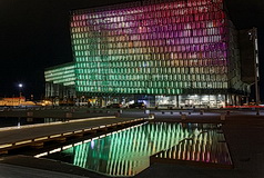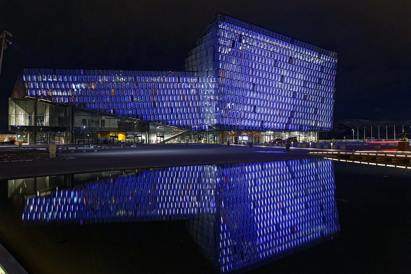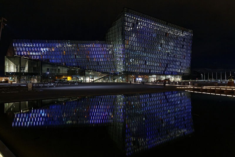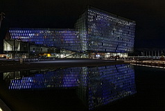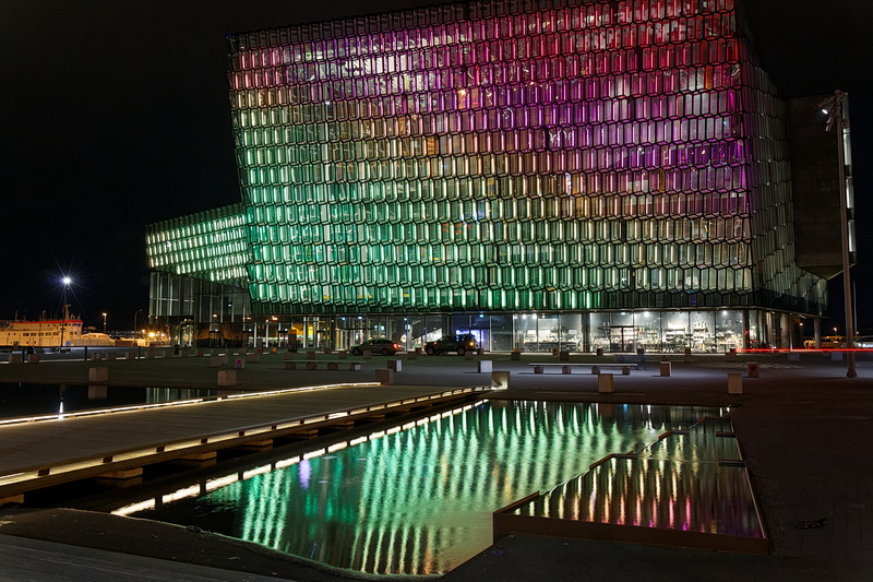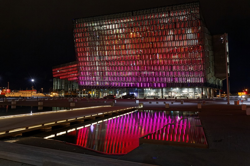 Eines der Wahrzeichen von Reykjavik ist die Harpa, das 2011 eingeweihte Konzerthaus und Konferenzzentrum am alten Hafen. Das Farbenspiel der phantasievoll beleuchteten Glasfassaden des Künstlers Olafur Eliasson ist ein populäres Fotomotiv.