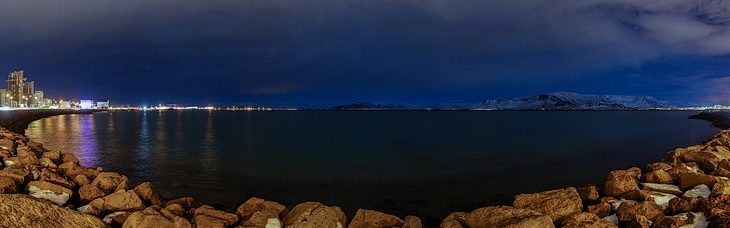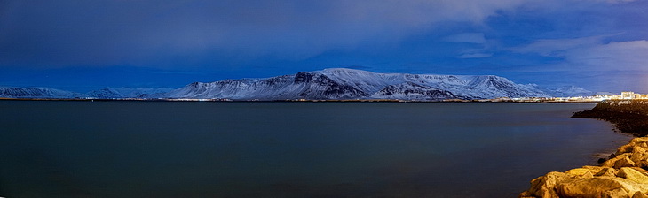 Abendspaziergang an der Küstenstraße Sæbraut mit Blick nach Norden auf das etwa 20 km lange Gebirgsmassiv des Esja, ein beliebtes Wander- und Klettergebiet auf der anderen Seite des Kollafjörður Fjords. Hier befindet sich auch eines der meistbesuchten Kunstwerke in Reykjavik, das im Jahr 1986 von Jón Gunnar Árnason gestaltete Sonnenschiff Sólfar.