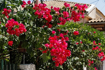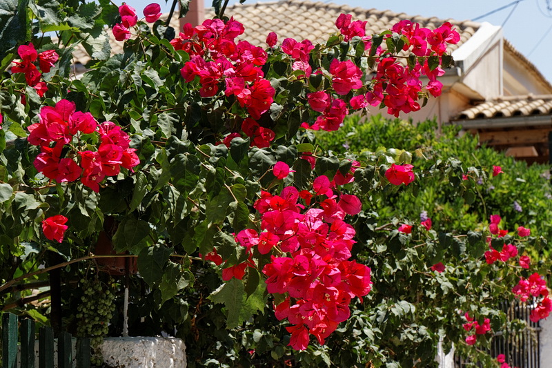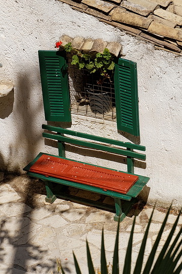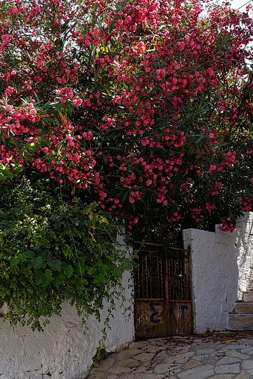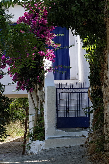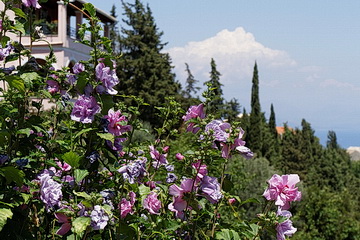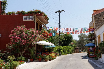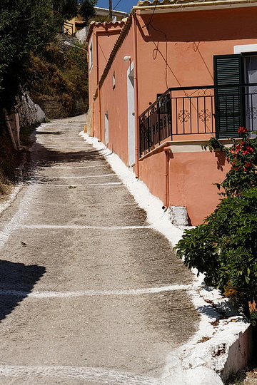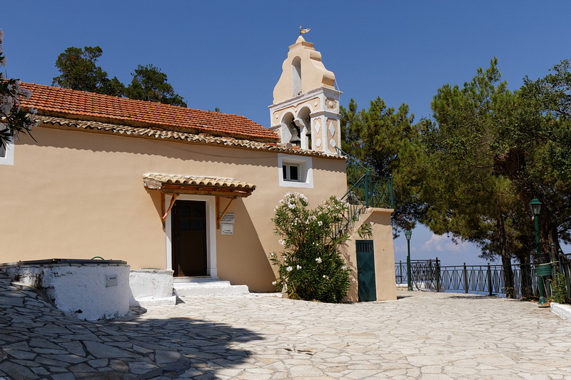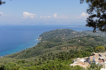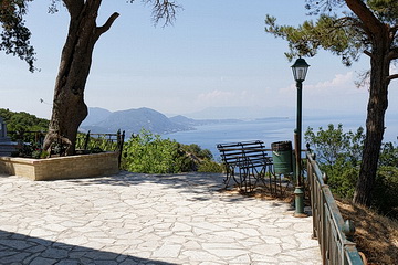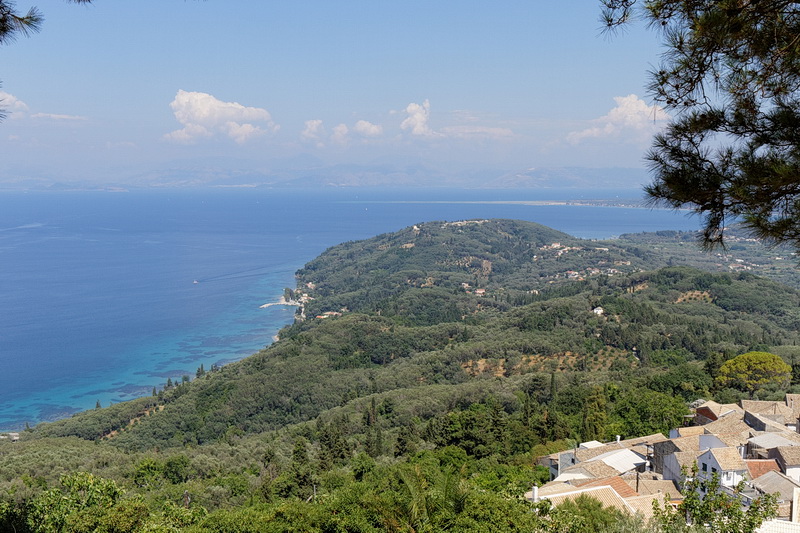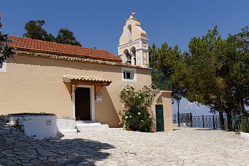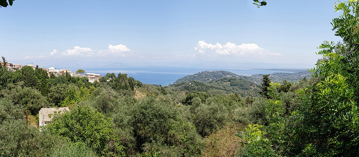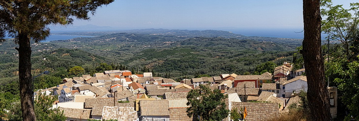 Narrow alleys are leading to one of Corfu's finest lookouts, the church at the top end of the village. The magnificent view covers a great part of the island from the mountainous north up to the southern cape where the island of Paxos can vaguely be discerned.