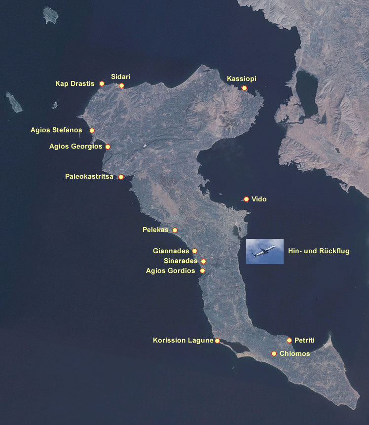 Korfu ist mit knapp 600 km² die zweitgrößte der Ionischen Inseln, die sich entlang der griechischen Westküste von Albanien bis zum Peloponnes erstrecken. Durch das ausgeglichene Klima und eine üppige Vegetation mit (wahrscheinlich) mehr als 4 Millionen Olivenbäumen, gilt Korfu als 'grüne' und sicherlich auch eine der abwechslungsreichsten Inseln Griechenlands. Vom gebirgigen Norden mit dem Pantokrator (906 m) als höchstem Punkt ersteckt sich die Insel über 60 km nach Süden. Dazwischen findet man eine vielfältige Landschaft mit steilen Küsten am Kap Drastis, sehenswerten Buchten bei Paleokastritsa bis zu den Sandstränden an der Korrison Lagune.