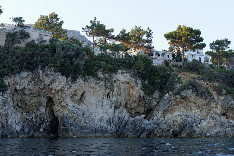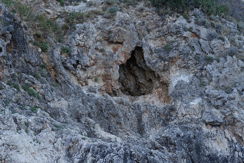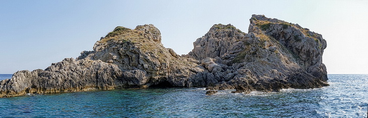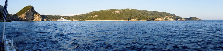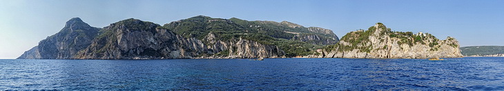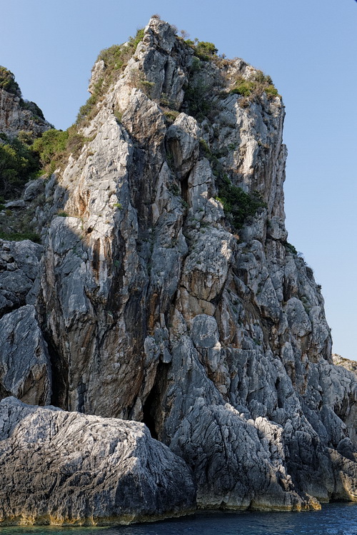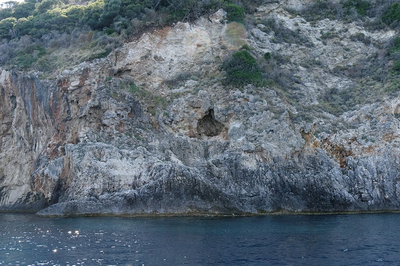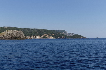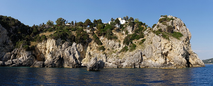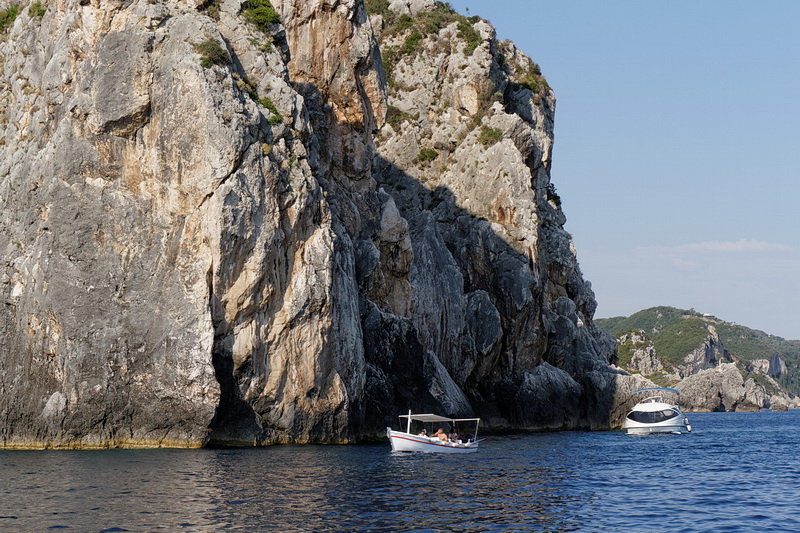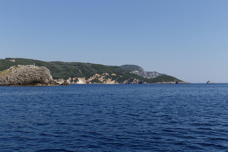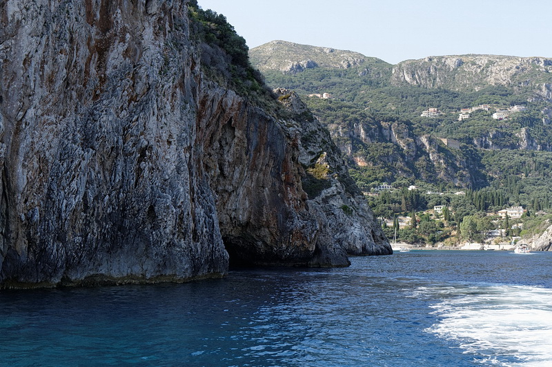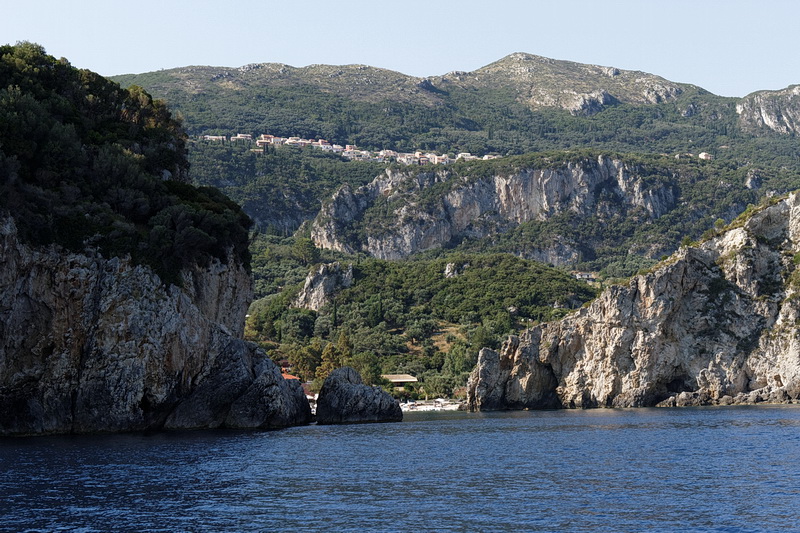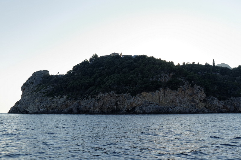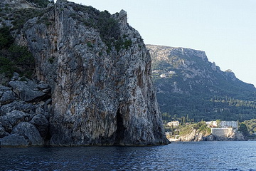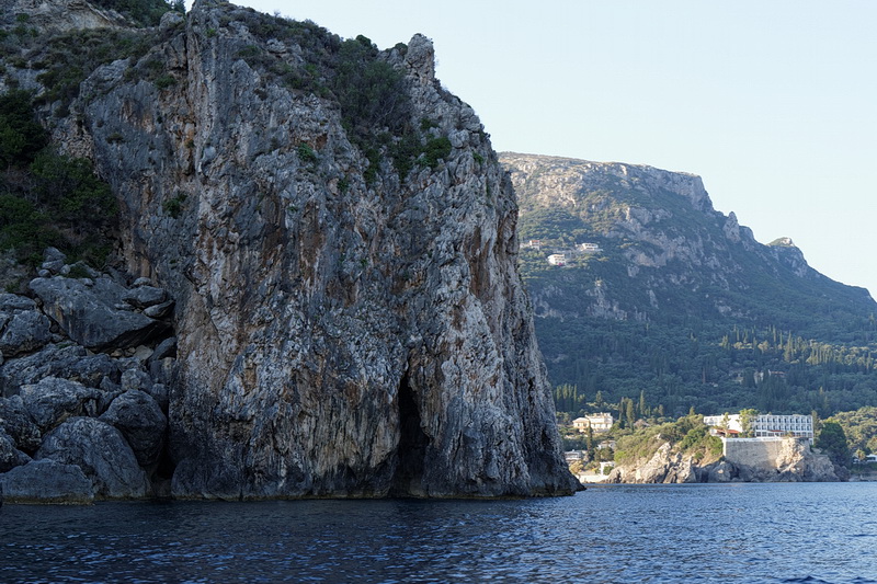 Passing the bay of Agios Spyridon and Panagia Theotokos Monastery we stopped at a rock about 300 m from the shore and had a magnificent view of the monastery, the village of Lakones and the massive rock on the left with Angelokastro Castle on top.