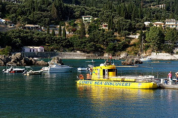 Im Hafen von Paleokastritsa gibt es mehrere Möglichkeiten, die Küste zu erkunden. Eine davon ist die Fahrt mit dem 'Yellow Submarine' das zwar nicht untertaucht, aber durch seine abgesenkte Glaskonstruktion einen Unterwasser-Rundumblick ermöglicht.