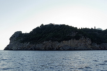 Vorbei an der Bucht von Agios Spyridon und dem Kloster Panagia Theotokos führt die Fahrt zu einem etwa 300 m vom Festland entfernten Felsen, mit bester Aussicht auf das Kloster, die Ortschaft Lakones im Hintergrund und den mächtigen Felsaufbau links, auf dem sich die Burg Angelokastro befindet.