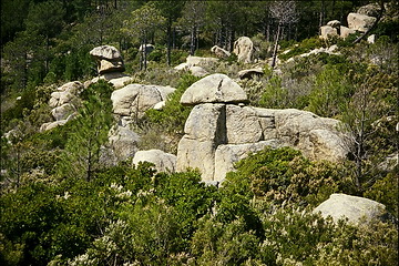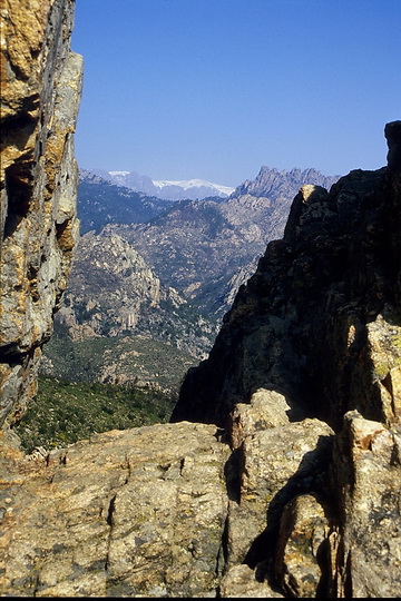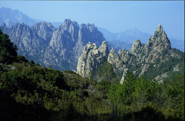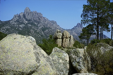 Rock scenery at around 1000 m just below Cima di Capello. The rocks of the Bavella range and Punta Velaco (1483 m) in western direction.