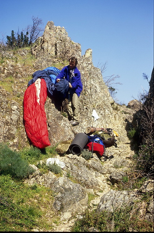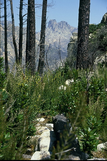 Our dewy sleeping bags dried quickly in the Mediterranean sun. Through burned pine forest we followed the well marked path up the eastern slopes of the Massif de San Martinu.