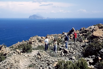 On the ascent of Monte Pilate (476 m), the youngest volcano in the north-eastern part of Lipari. The islands in the background are Panarea and Stromboli (behind, about 50 kms north-east of Lipari). Pumice stone quarries have to be passed on the way to Monte Pilate. The island in the background is Salina with Monte Fossa delle Felci (960 m), the highest peak of the Aeolian Islands.