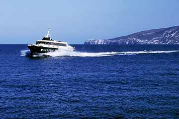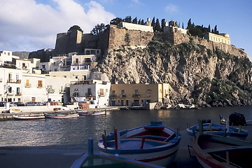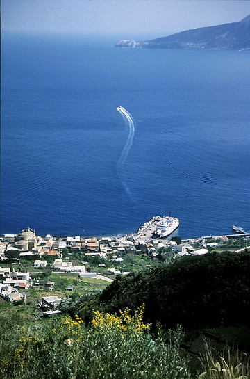 Hafen von Lipari, von wo aus man mit dem Schiff in einer halben Stunde nach Salina gelangt. Im Hintergrund erkennt man die Bimssteinfelsen von Aquacalda an der Nordküste von Lipari.
