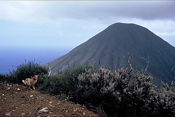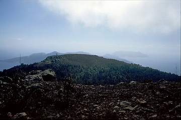 Blick vom Hauptgipfel zum Südgipfel des Monte Fossa delle Felci (960 m). Im Hintergrund links Lipari und rechts Vulcano. Der 100 km entfernte Ätna von Salina aus. Mehr war aus dem Film von 1988 nicht herauszuholen.