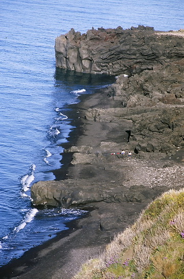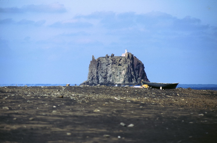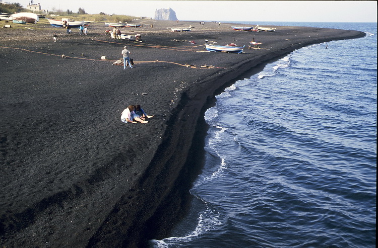 Nur wenige Badegäste säumten den dunklen Sandstrand (1988). Der 50 m hohe Strombolicchio ist der Ur-Stromboli, der Überrest des einstigen Vulkans 2 km nordöstlich der Insel.