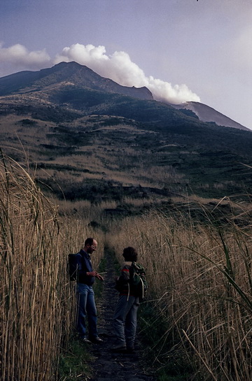 Die engen Gassen prägen das Bild der Ortschaft Stromboli. Es gibt zwar Dreiräder aber so gut wie keine Autos und keine grösseren Strassen auf der Insel. Von unserem Zimmer in einem kleinen Turm hatten wir einen guten Blick zum Vulkan. Abends waren wir bei Wolfgang Müller zu Gast, einem berühmten Vulkanforscher, dem es besonders der Ätna angetan hat aber auch andere Vulkane wie der Ol Doinyo Lengai. Narrow alleys are typical for the village of Stromboli. As cars are not allowed on the island three-wheelers or scooters are dominating. From our flat we had a nice panorama of the volcano. In the evening we met Wolfgang Mueller, a famous vulcanologist who has a special interest in Etna but also other volcanoes like Ol Doinyo Lengai. |