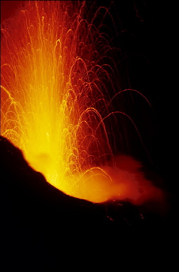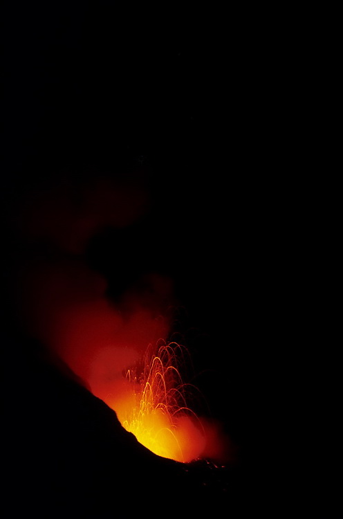 Etwa alle 15 Minuten schiesst mit einem Zischen eine Lavafontäne aus einer Bocca. Deutlich zu erkennen sind die ballistischen Parabelbahnen der hochgeschleuderten Lava. Unbedingt ein kleines Stativ mitnehmen.