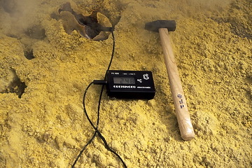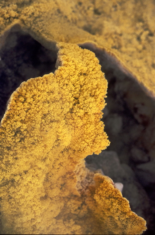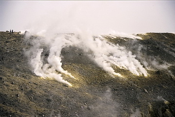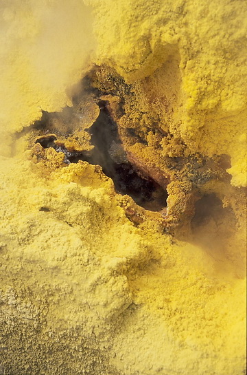 Gelbe Schwefelablagerungen bilden sich um die Fumarolen, die den Geruch von faulen Eiern verbreiten.