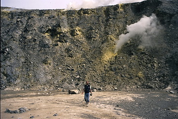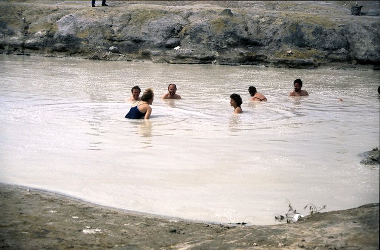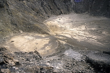 After we had circulated the crater we went back passing the fumaroles with their pungent smell. Right of the center we could see the bay and the mud pool (see next picture).