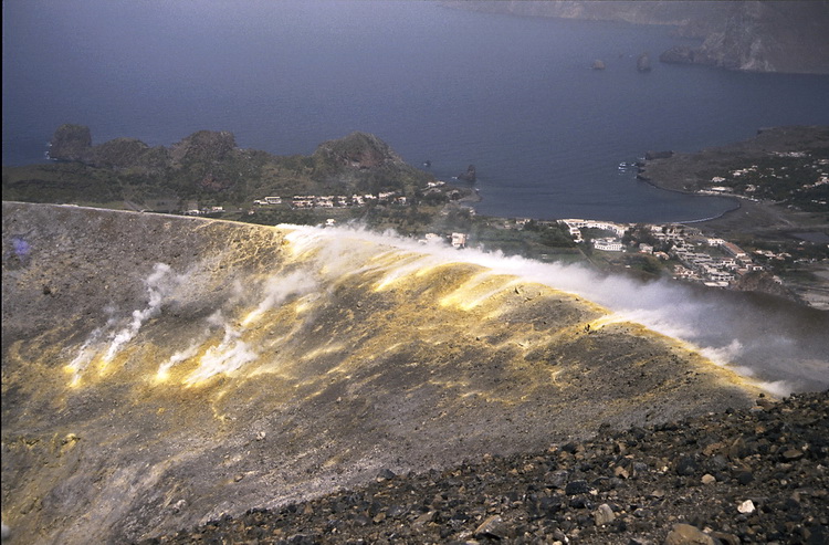 Vulcano is the southmost of the Aeolian Islands and just about 20 km away from the northern coast of Sicily. Like the other islands of the archipelago it is of volcanic origin. Fossa is the second active volcano of the Aeolian Islands clearly visible (and smellable) by the activity of fumaroles. Among vulcanologists this volcano is still rated as potentially dangerous. The last eruption is dated back to 1890 where lava bombs of several tons were thrown out of the crater. Today the volcanism mainly serves as a touristic attraction, the healing effect of the mineral containing mudbaths was already appreciated by the ancient Romans and Greeks.