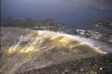 Schon vom Hafenstädtchen Ponte di Levante aus sieht man am Kraterrand die Schwefeldämpfe der Fossa von Vulcano. Den Kraterrand selbst erreicht man auf einem Fußweg nach gut einer Stunde.