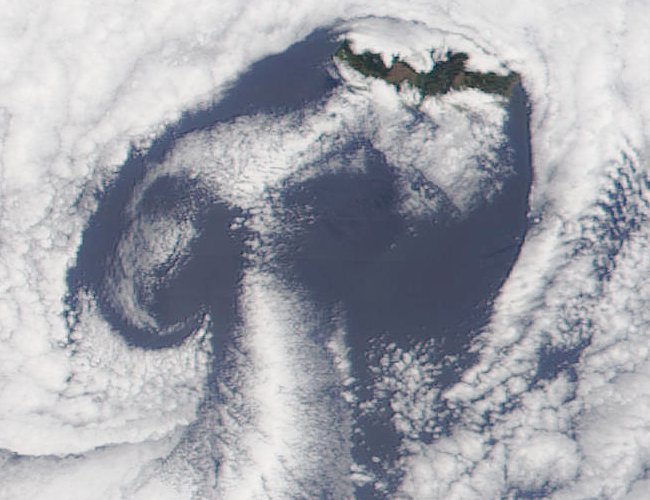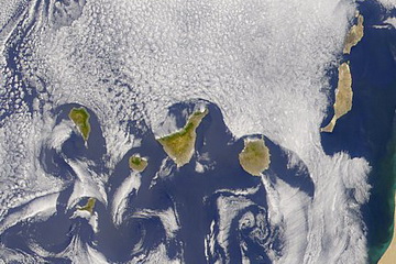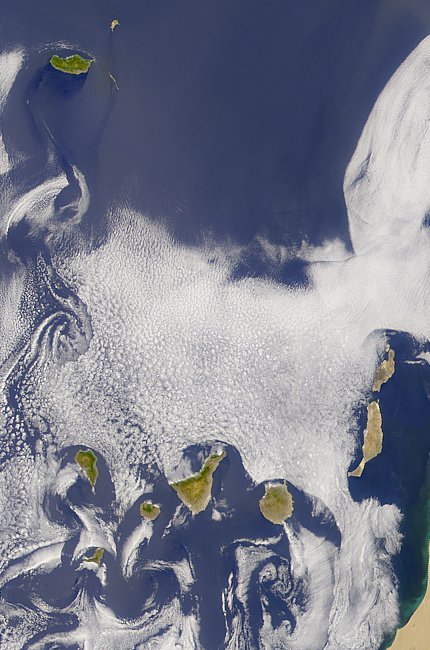 Madeira and the Canaries seen from space. Trade wind clouds cover a great part of the island.