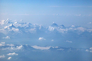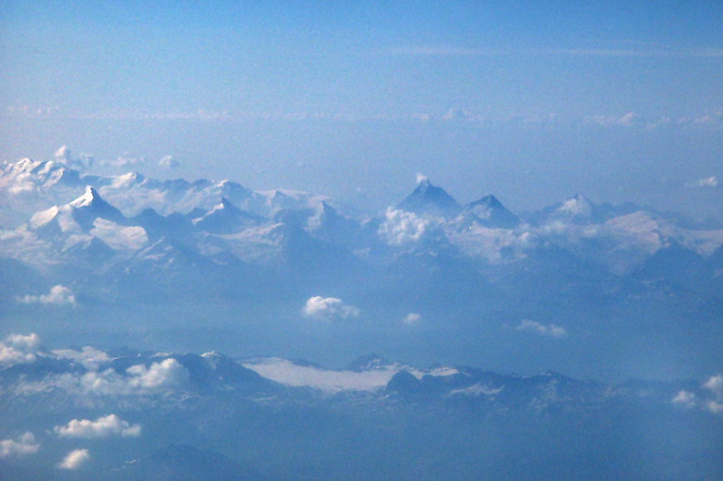 Flug über das Schweizer Mittelland mit Weisshorn und Monte Rosa links, sowie Matterhorn mit Dent d' Herens rechts. 10.000 m hohe Gewitterwolken auf dem Flug nach Madeira.