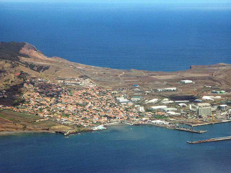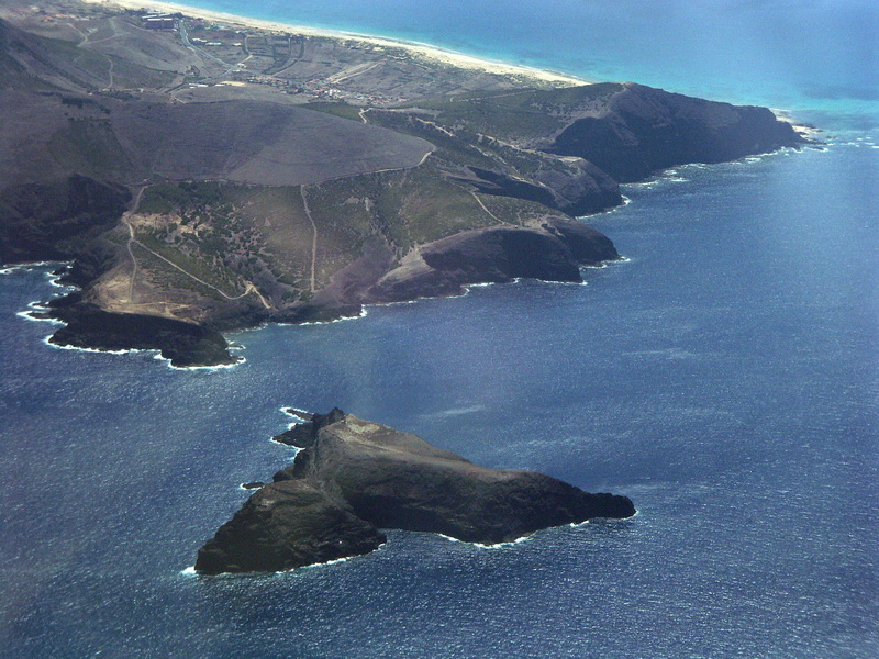 Die Badeinsel Porto Santo, die Madeira nordöstlich vorgelagert ist. Sie hat kilometerlange Sandstrände aber wenig Vegetation und ist wie das gesamte Archipel vulkanischen Ursprungs. Anflug auf Madeira mit Blick auf die Nordküste. Oft sind die Berge in Passatwolken gehüllt, die bedrohlicher aussehen, als sie es sind.