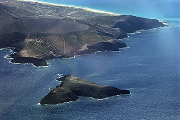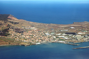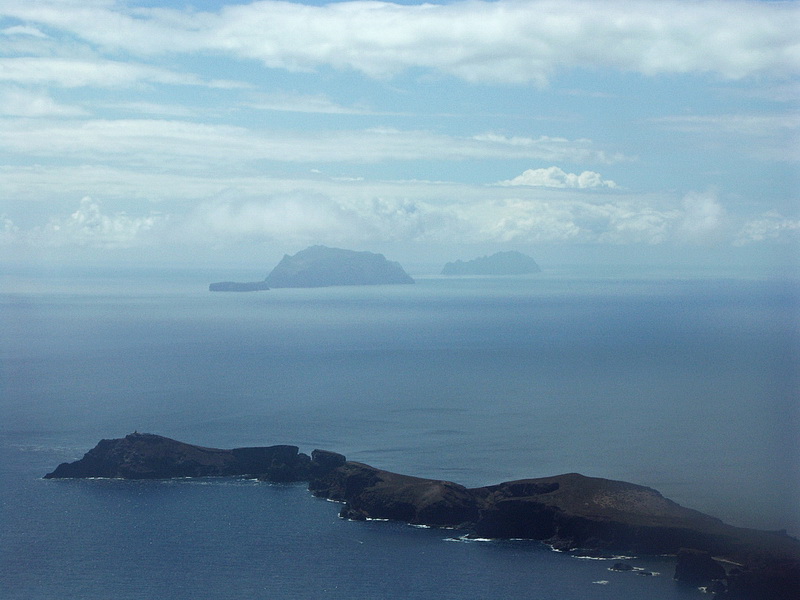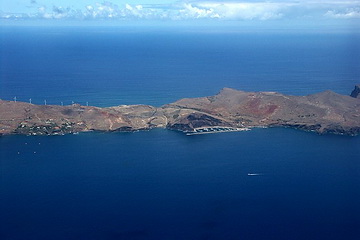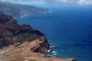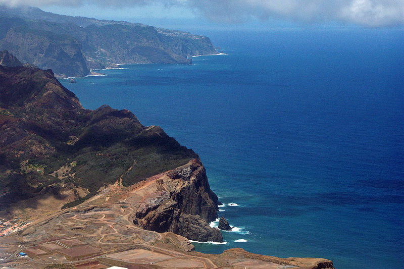 The north-eastern coast becomes visible. The rock in the center of the picture is the 590 m 'Penha de Aguia' (eagles' rock) near Porto da Cruz. At low altitude we cross the eastern peninsula of Porto de Sao Lourenco. The sudden end of the vegetation becomes apparent.