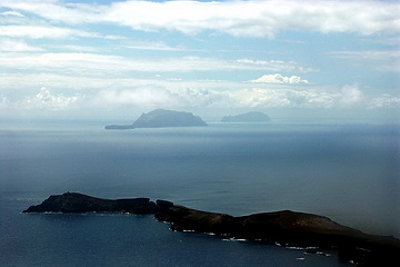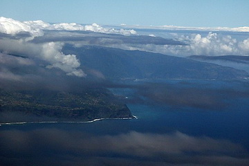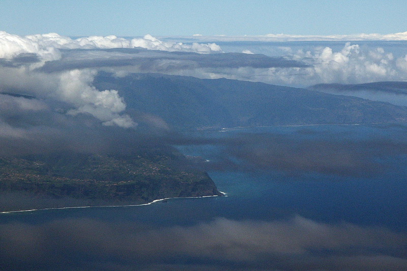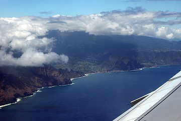 The island of Porto Santo, north-east of the main island has got miles and miles of sandy beaches but only little vegetation. Like the whole archipelago it is of volcanic origin. Approaching Madeira looking down on the east coast. Very often the mountains are covered by trade wind clouds which look more threatening than they are.